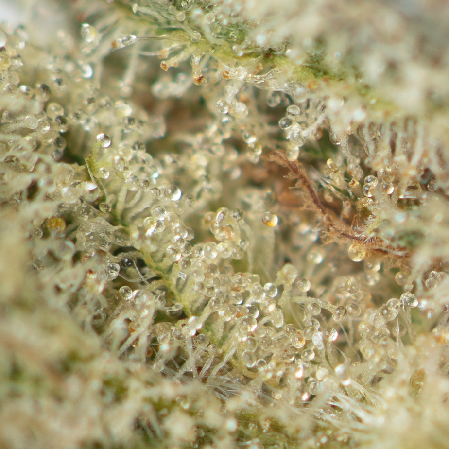 Jelly Breath buds have a rounded, spade-like shape with a pale olive green colouring, plenty of pale orange pistils, and a heavy frosting of milky trichomes. Its terpene profile consists of caryophyllene, limonene, myrcene, humulene, and